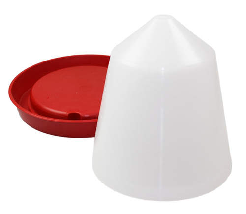 The 6 litre Combo Poultry Drinker from BEC has a red base saucer and a white opaque container, comes with four legs.